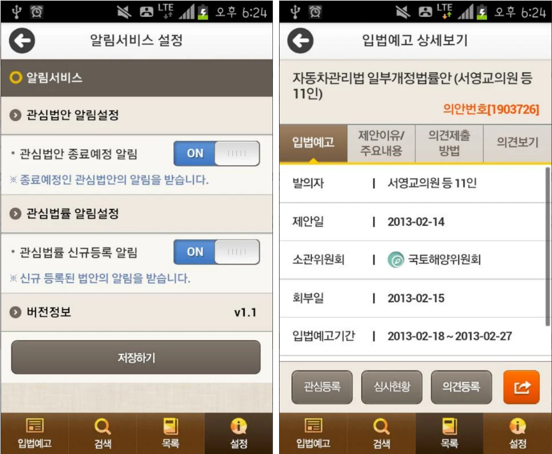 입법예고시스템 앱은 위원회에 회부된 법률안의 입법취지와 주요내용을 게재하여 국민들에게 미리 알리는 어플리케이션입니다. 진행중?종료된 입법예고를 위원회별, 법률안명 등으로 조회할 수 있으며, 진행중 입법예고의 경우 로그인하여 의견을 제출할 수 있습니다. 또한, 관심법률안의 상태변경 정보 알림서비스 및 SNS공유가 가능합니다.